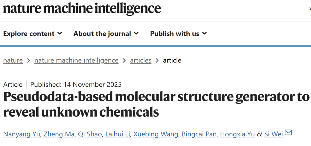 Yu, N., Ma, Z., Shao, Q. et al. Pseudodata-based molecular structure generator to reveal unknown chemicals. Nat Mach Intell (2025).