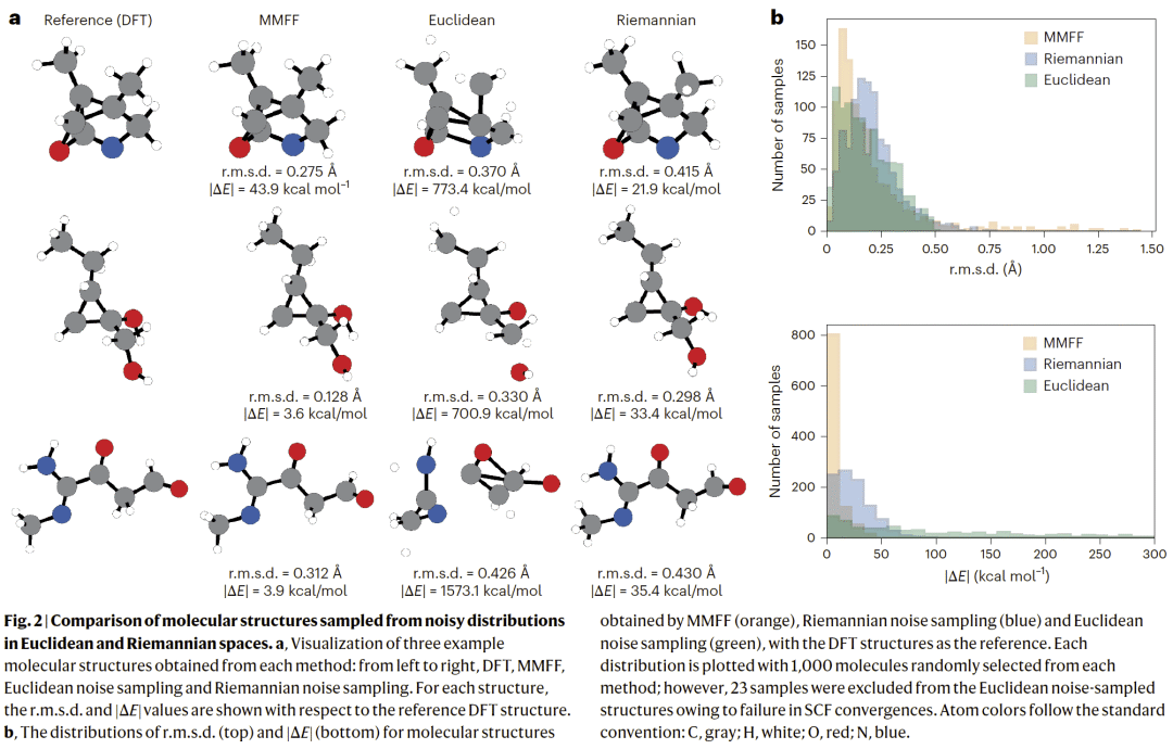 图2|欧几里得空间与黎曼空间噪声分布采样所得分子结构的比较。