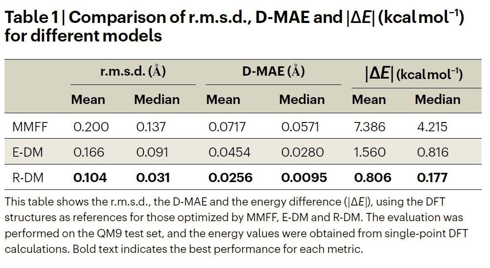 在 QM9 数据集上,R-DM 从力场初始结构出发,显著降低了结构偏差与能量误差。与欧几里得去噪模型相比,R-DM 在能量精度上提升尤为明显,平均误差达到化学精度标准。
