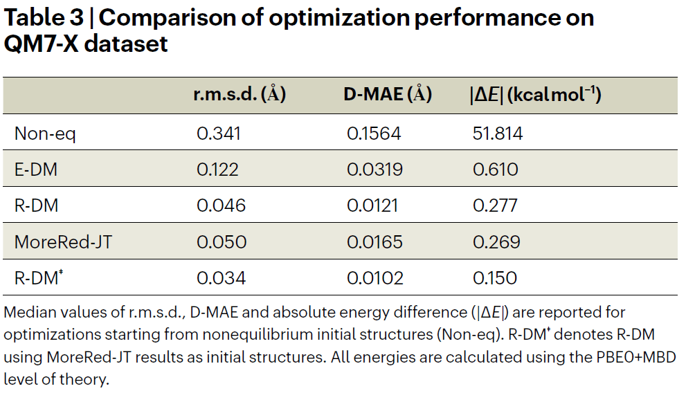 在包含非平衡构象的 QM7-X 数据集上,R-DM 依然在结构与能量指标上全面优于基线方法,显示出良好的泛化能力,但也揭示了在高度扭转敏感构象下仍存在改进空间。