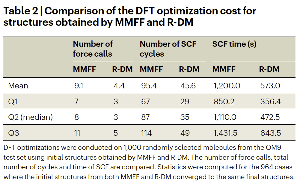 R-DM 生成的结构可显著减少后续量子化学优化所需的迭代次数与计算时间,在保持高精度的同时降低总体计算成本。