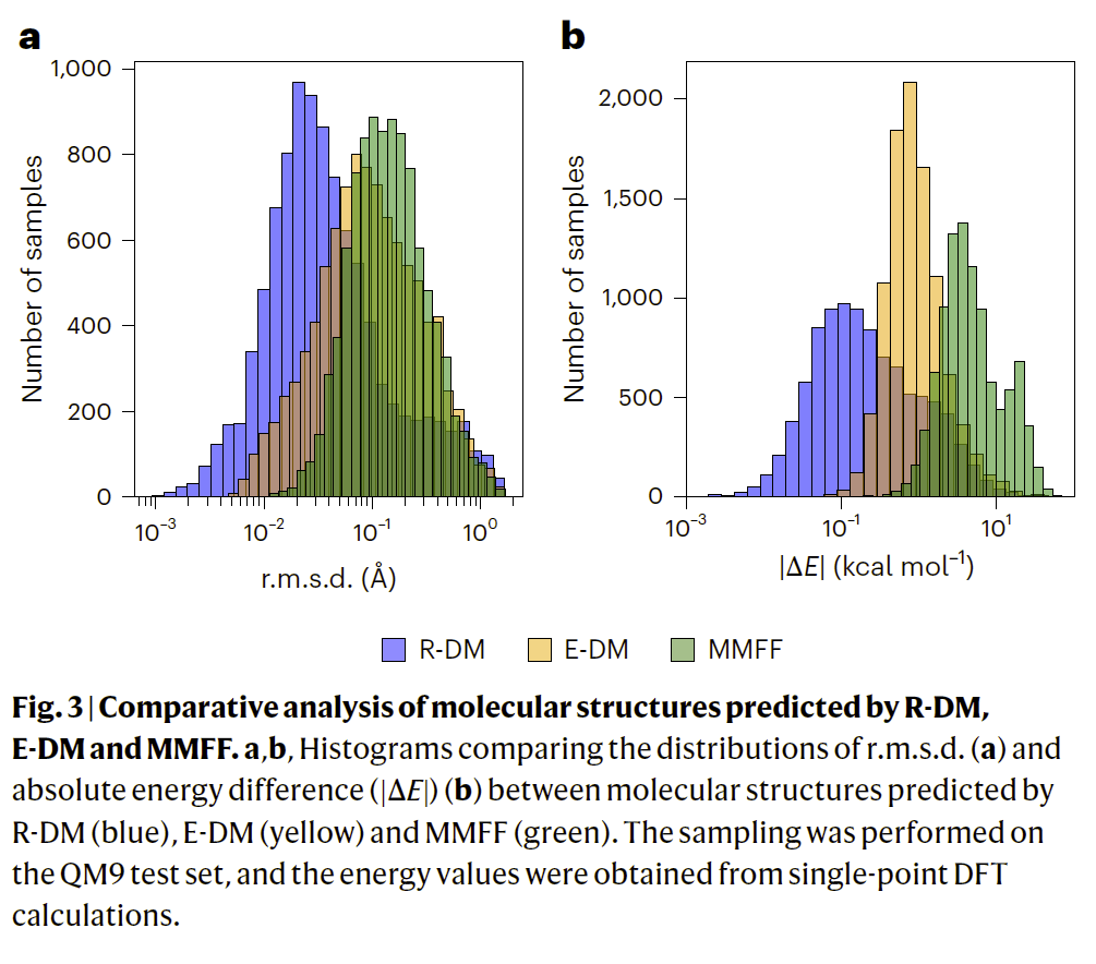 图 3|R-DM、E-DM 与 MMFF 预测分子结构的对比分析。