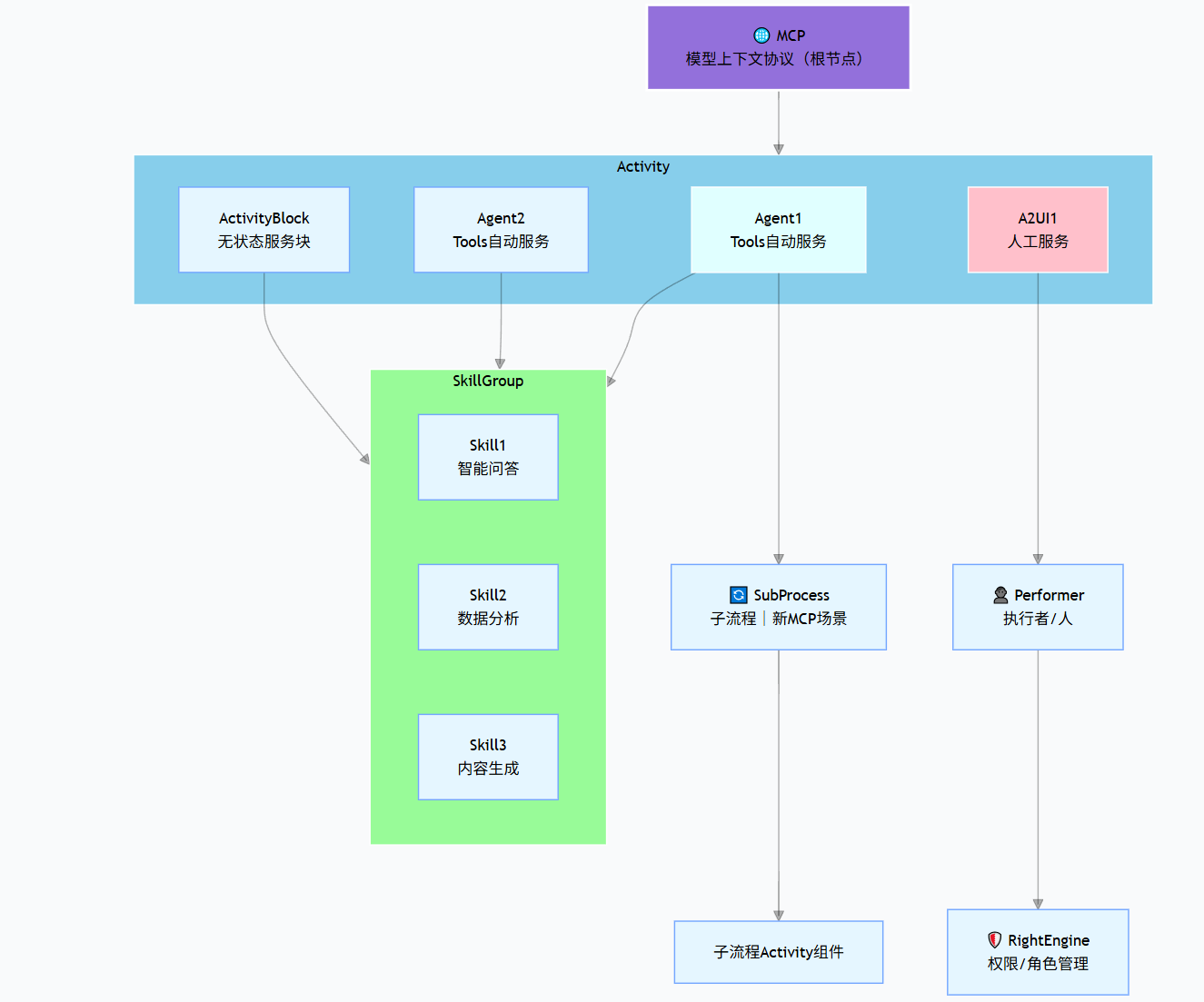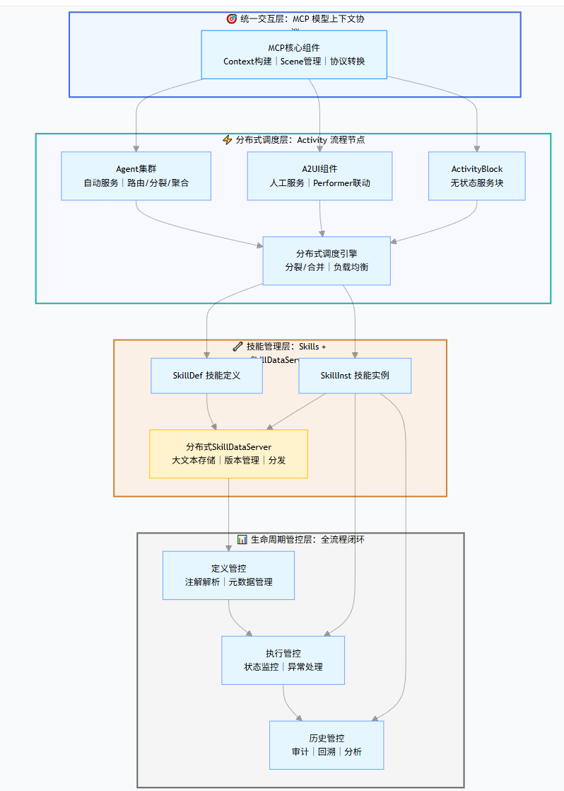生命周期管控层 | 覆盖Agent/Skills从定义到执行的全环节管控,支持审计与回溯 | 注解驱动、全链路可观测 |