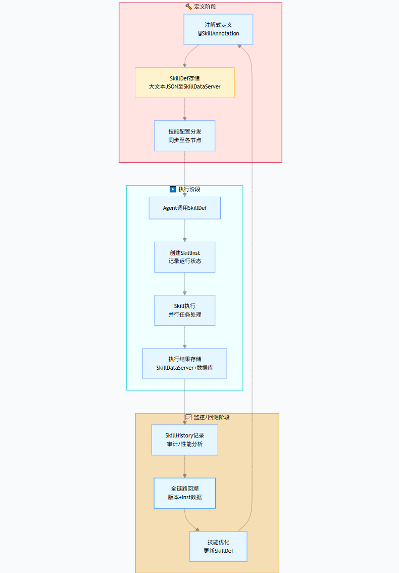 监控/回溯阶段 | 记录执行历史,基于SkillDataServer版本数据实现全链路回溯,迭代优化技能定义 | SkillHistory、SkillDataServer |