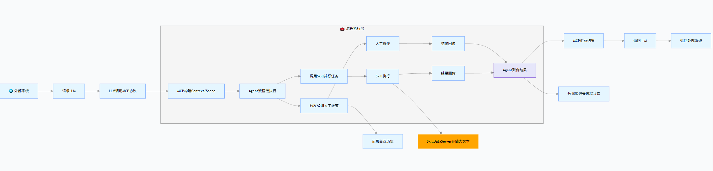 执行阶段 | Agent调用技能定义生成运行实例,执行并行任务,结果双存储(SkillDataServer+数据库) | SkillInst、Agent |