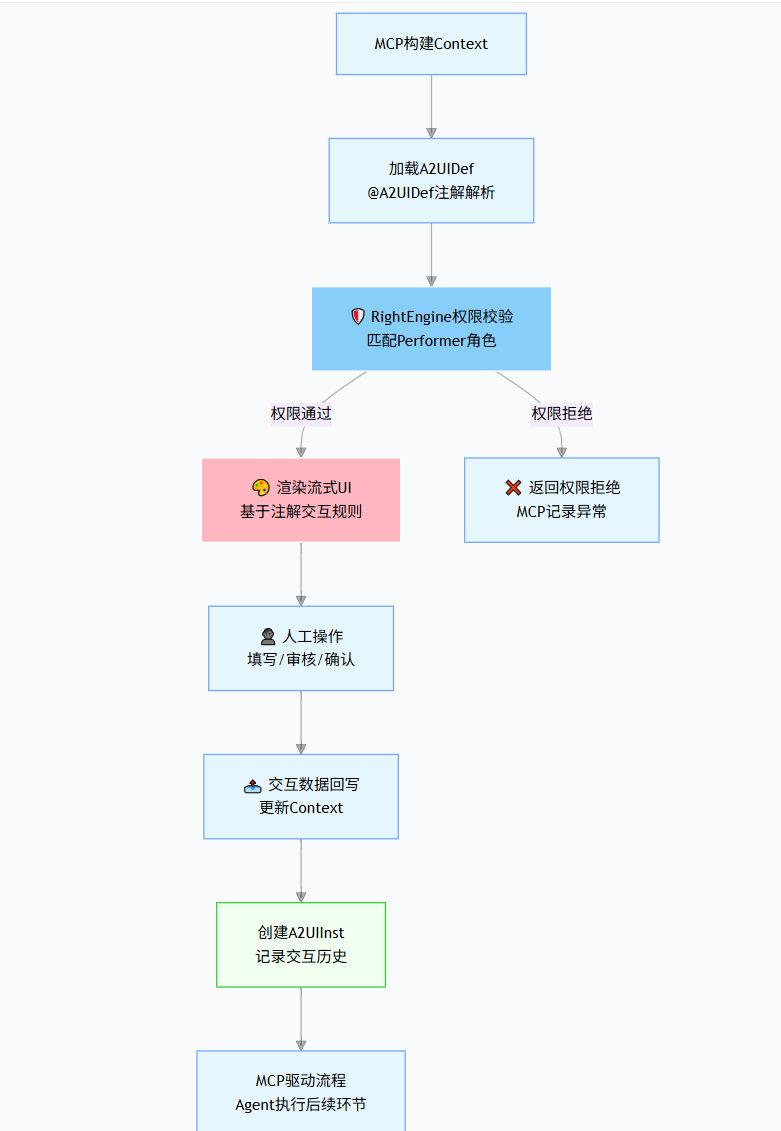| 类/方法 | 定义A2UI交互规则、权限依赖 | 交互类型、权限角色、UI模板 |