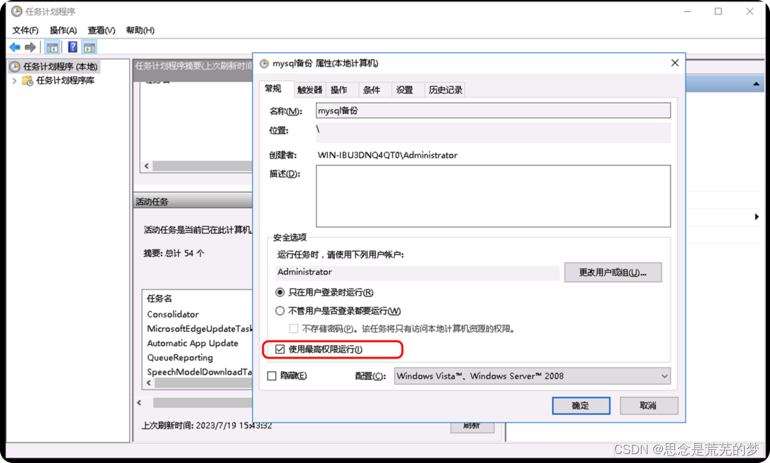 点击完成后将弹出属性界面,我们勾选上最高权限,检查一下每一个tab是否是我们设置的属性,然后点击确定即可: