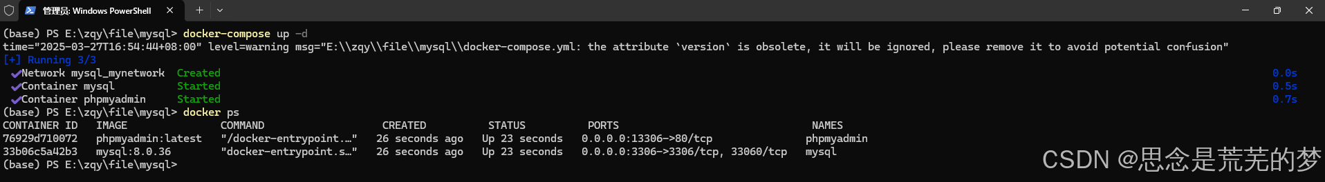 mynetwork:3、打开CMD,进入到该目录:E:\zqy\file\mysql,执行命令docker-compose up -d,等待docker拉镜像,启动即可。启动成功后,使用docker ps 查看已经启动的容器: