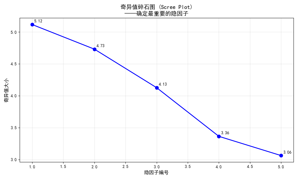 图片内容描述:确定保留多少隐因子,在"拐点"处最佳,前2-3个因子包含大部分信息,后续因子可能主要是噪声