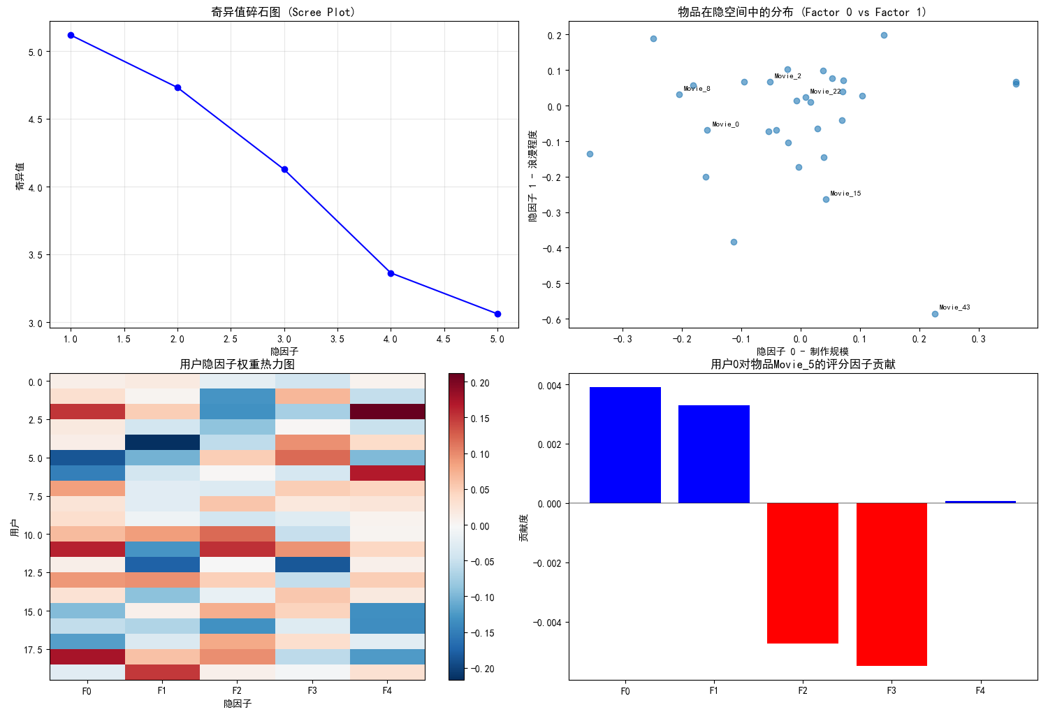 axes[1, 1].set_title(f'用户{user_idx}对物品{recommender.item_ids[item_idx]}的评分因子贡献')