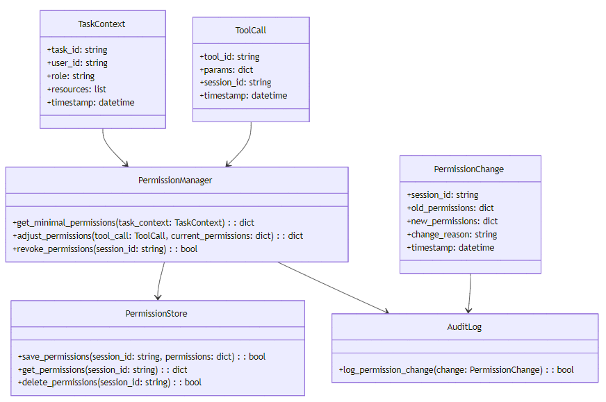 设计了动态权限最小化框架,基于任务上下文动态分配 MCP 工具权限,确保工具仅拥有执行当前任务所需的最小权限。该框架支持权限的实时调整和撤销,有效降低了权限滥用的风险。