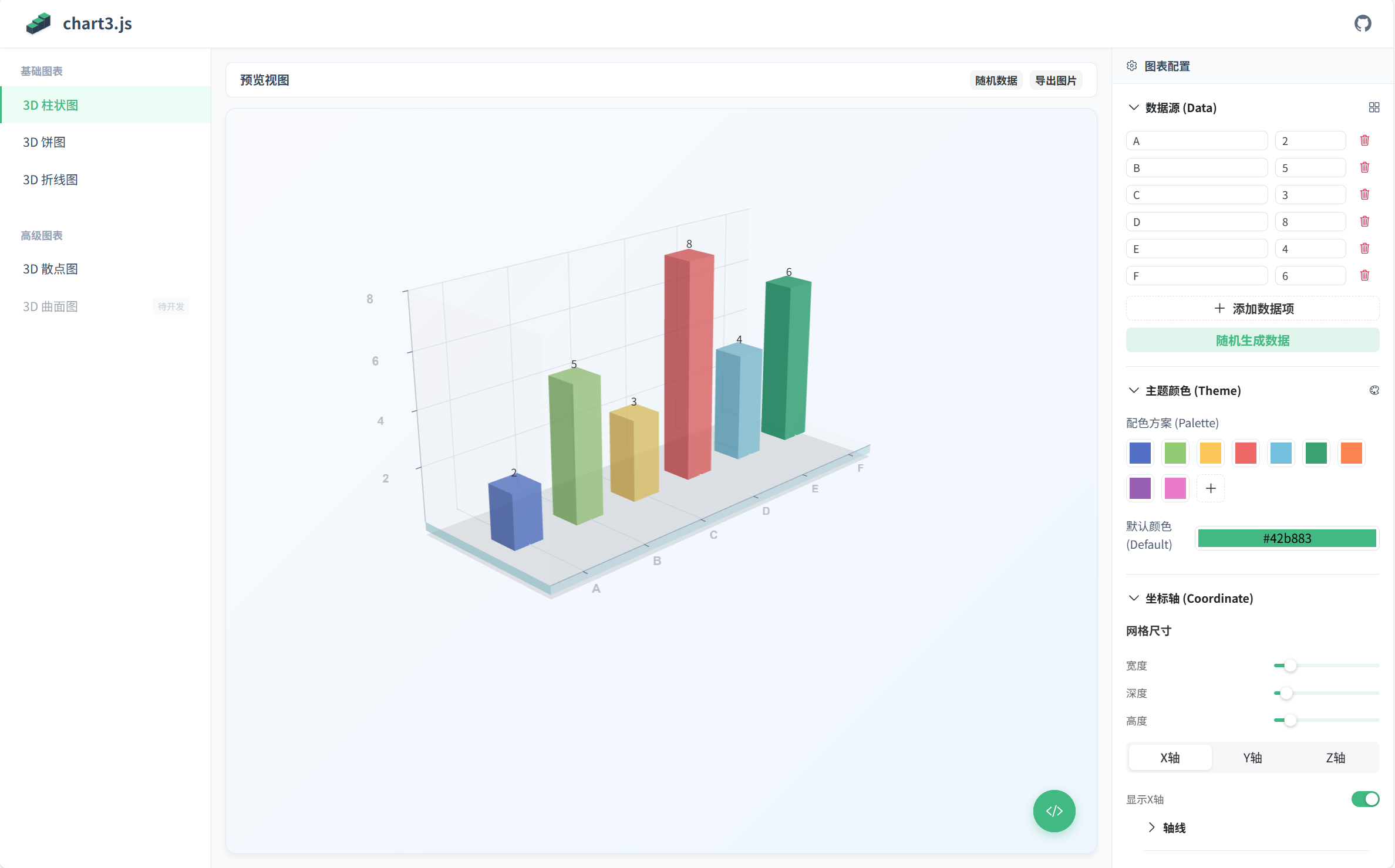 在实际开发中,我们往往面临两难的选择:要么使用传统的 2D 图表库(如 ECharts)通过“伪 3D”来实现效果,但缺乏立体感和自由视角;要么直接使用 Three.js 从零撸,成本高且难以复用。