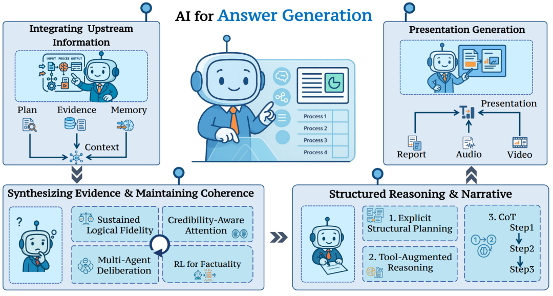 与传统生成任务不同,DR 场景的问答更强调结论与证据之间的对应关系,以及整体论证过程的逻辑一致性。因此,通常需要智能体显式整合多源证据与中间推理结果,使输出不仅在语言层面连贯,还能够支持事实核验与过程回溯。