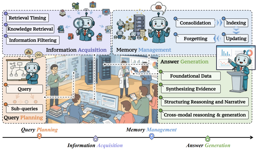 (4)记忆模块的构建:记忆模块的构建是 DR 系统中最具挑战性的部分之一。如何在记忆容量、检索效率与信息可靠性之间取得平衡,并将记忆机制稳定地融入端到端训练流程,仍是当前研究中的关键难题。