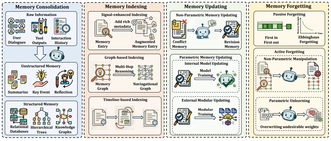 在开放任务中,智能体往往需要跨越多轮交互、多个子问题与不同信息源。记忆模块是支撑 DR 系统长期运行与持续推理的核心基础设施,为系统提供状态延续和经验累积,使模型能够使用长期长线推理任务。现有工作通常将记忆管理过程拆解为四个相互关联的阶段:记忆巩固、记忆索引、记忆更新与记忆遗忘。