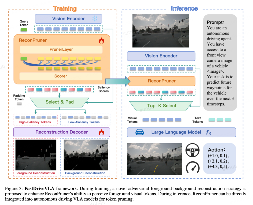 图 3:FastDriveVLA 框架。在训练阶段,提出了一种新颖的「前景 - 背景对抗重建」策略,以增强 ReconPruner 对前景视觉 token 的感知能力;在推理阶段,ReconPruner 可直接嵌入自动驾驶 VLA 模型,用于 token 剪枝。