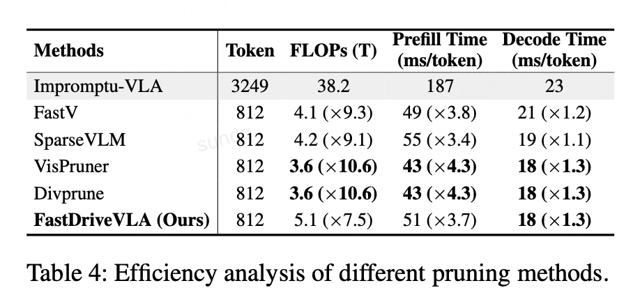 实验结果显示,在不同剪枝比例下,FastDriveVLA 在 nuScenes 开环规划基准测试中均取得了 SOTA 性能。FastDriveVLA 也非常高效,当视觉 token 数量从 3249 减少至 812 时,FastDriveVLA 的 FLOPs 直降约 7.5 倍;在 CUDA 推理延迟方面,FastDriveVLA 将预填充(prefill)时间减少了 3.7 倍、将解码(decode)时间减少了 1.3 倍,显著提升了推理效率。