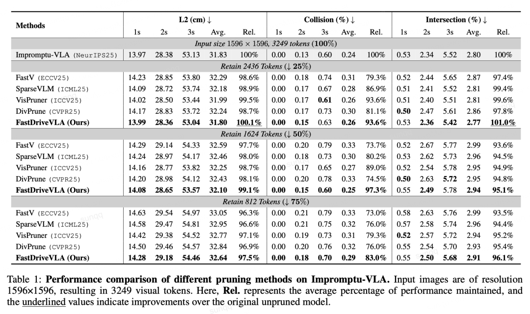 我们采用 Impromptu-VLA 作为视觉 token 剪枝的基础模型,在专为城区自动驾驶设计的大规模基准测试数据集 nuScenes 上对不同剪枝方法进行了评估。nuScenes 数据集包含 1000 个驾驶场景、每个场景约持续 20 秒。测试时,我们总计使用了 6019 个测试样本,并通过 L2 轨迹误差、碰撞率、路外率三个指标来评估开环规划的性能。