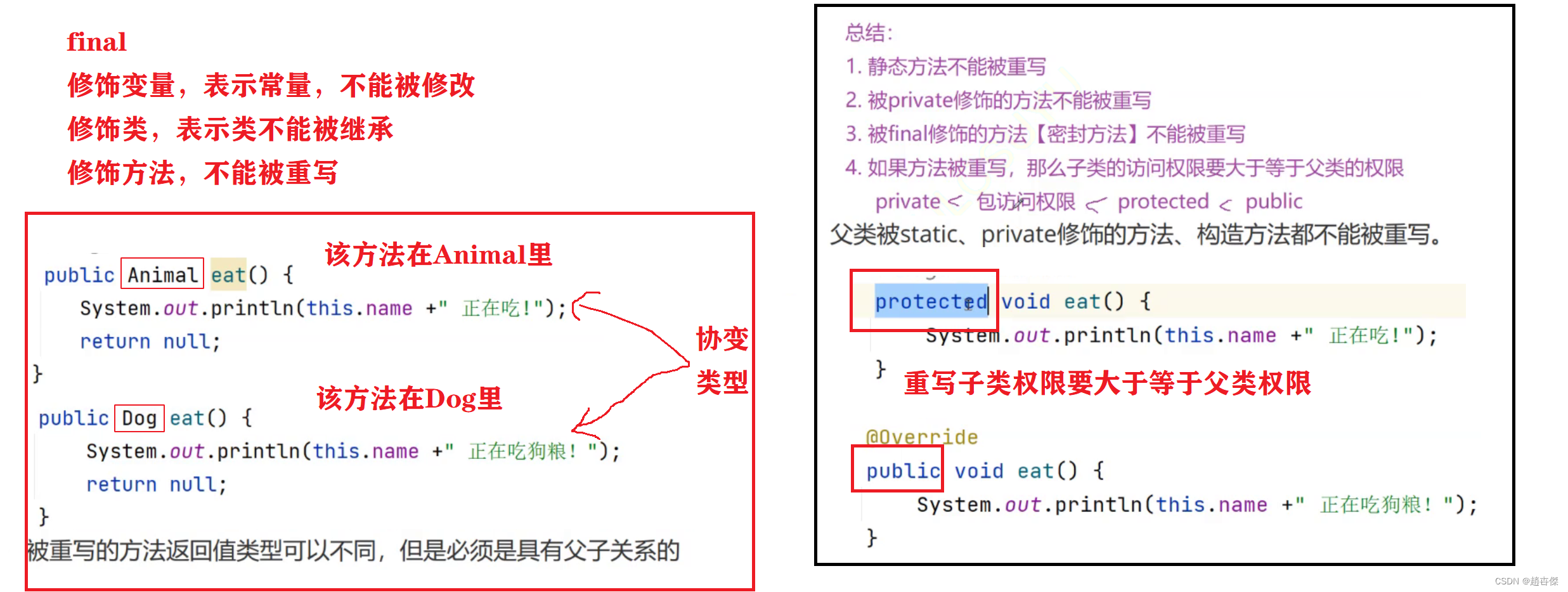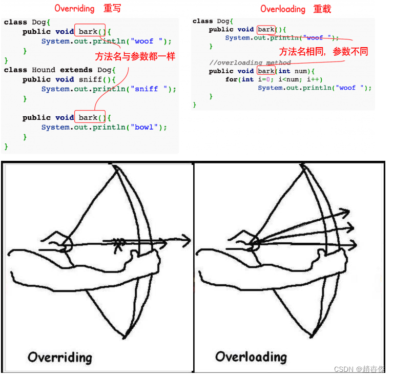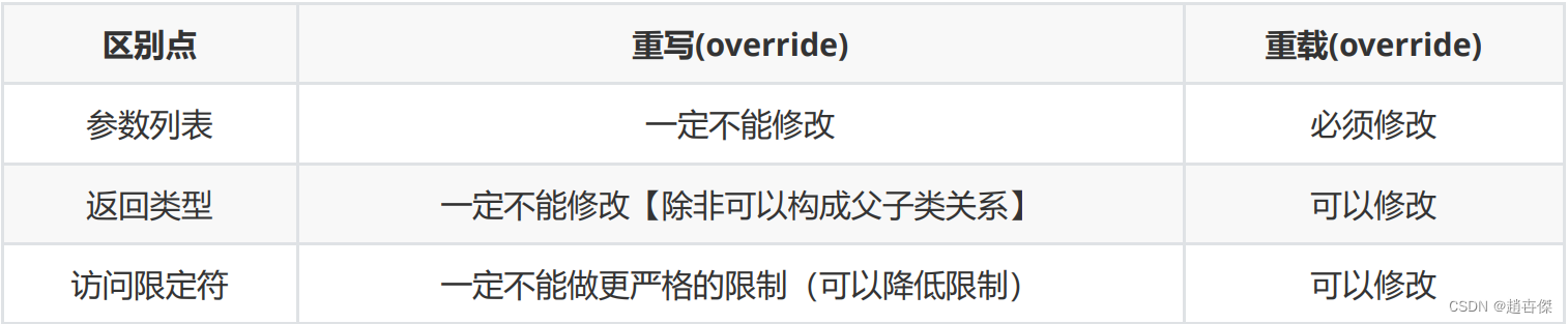 重写(override):也称为覆盖。重写是子类对父类非静态、非private修饰,非final修饰,非构造方法等的实现过程 进行重新编写, 返回值和形参都不能改变。即外壳不变,核心重写!重写的好处在于子类可以根据需要,定义特定 于自己的行为。 也就是说子类能够根据需要实现父类的方法。