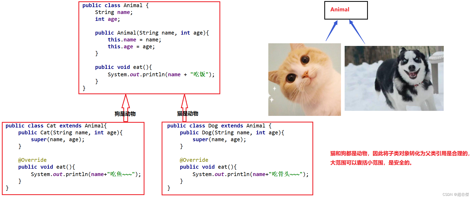 Animal animal = new Cat("元宝",2);animal是父类类型,但可以引用一个子类对象,因为是从小范围向大范围的转换。