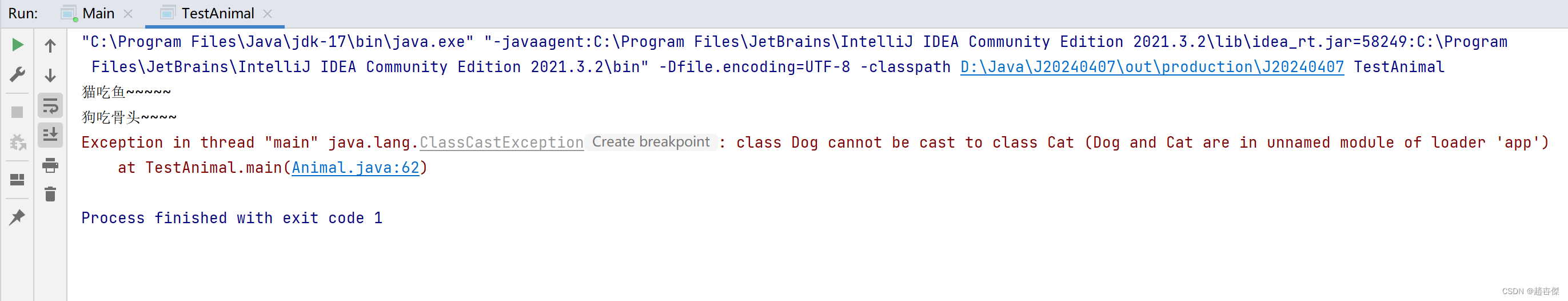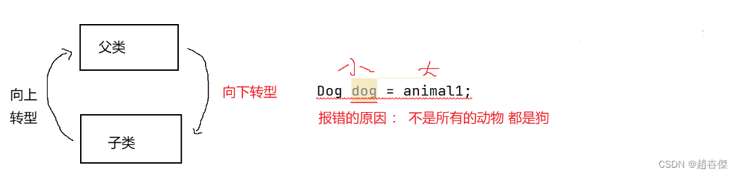 // 程序可以通过编程,但运行时抛出异常---因为:animal实际指向的是狗