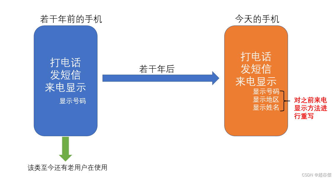 例如:若干年前的手机,只能打电话,发短信,来电显示只能显示号码,而今天的手机在来电显示的时候,不仅仅 可以显示号码,还可以显示头像,地区等。在这个过程当中,我们不应该在原来老的类上进行修改,因为原来的 类,可能还在有用户使用,正确做法是:新建一个新手机的类,对来电显示这个方法重写就好了,这样就达到了我 们当今的需求了。