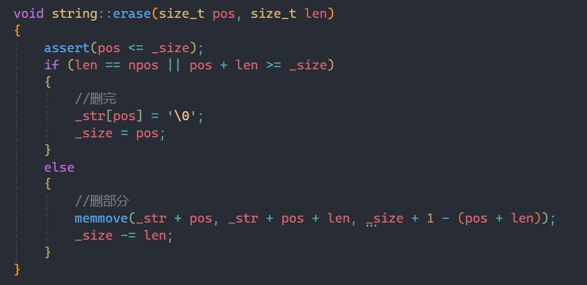 3.只删一部分直接把pos位置处的值置为'\0',再将_size移到pos处,这样也算完成了删除