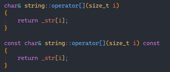 实现起来也简单,直接返回是相应位置的值即可。const类型和非const类型区别就是能否通过解引用来改变字符串的内容。