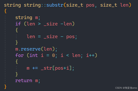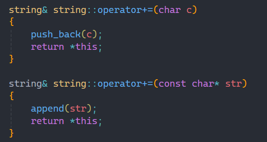 实现了push_back和append后,实现+=运算符重载就简单了很多,唯一需要注意的就是我们要返回的是字符串本身,所以要注意返回值是string。
