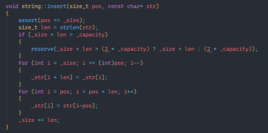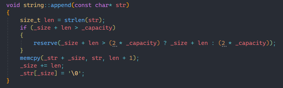 实现append时要先计算字符串的长度,并判断我们之前的扩容方式扩容后与_size+len谁更大,取更大的作为我们的扩容方式。