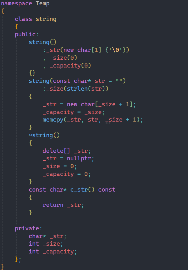 我们之前也讲过string类底层就是一个数组,所以我们在实现时也按数组来实现,并定义数组中数据的大小和容量,就和我们实现顺序表一样。