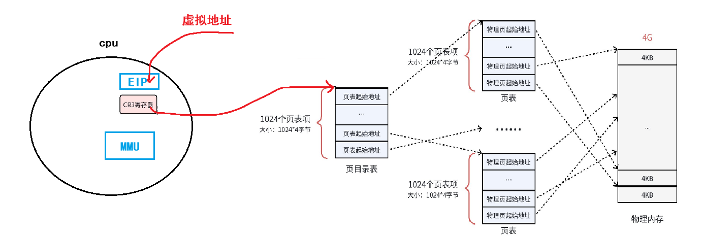 那么现在就为大家揭晓页表的真面目,我们之前认为页表就是只是一张表,其实不然,真正的页表其实是一个二级页表,在cr3寄存器中存储的其实是页目录表的起始地址,在这个页目录表中每一个页表项存储的都是一个页表的起始地址。