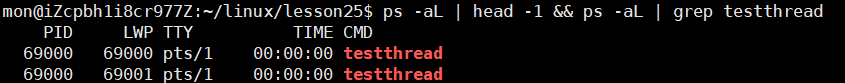 我们通过ps -aL命令就可以看到此时就有两个执行流,这两个执行流的PID是一样的,说明它们同属于一个进程,而后面的LWP(Light Weight Process)不一样证明了它们是不同的执行流。