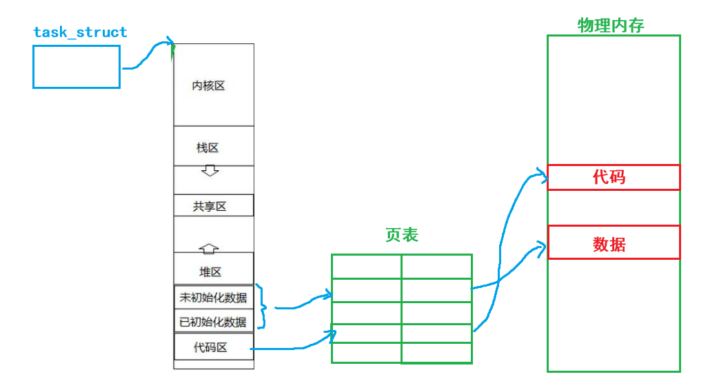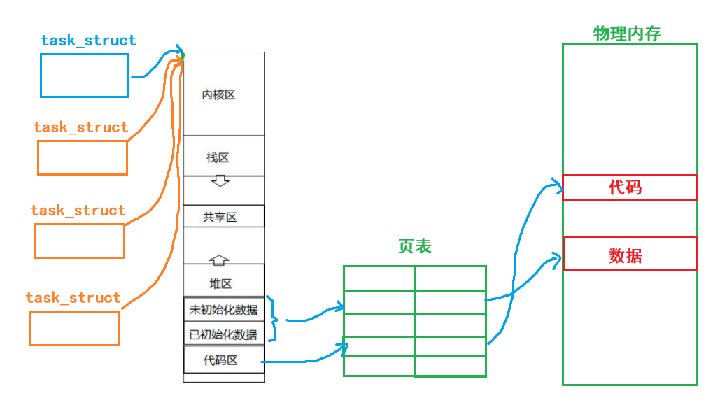在Linux中的做法就是只创建task_struct,也就是多个task_struct共用一套东西,包括:虚拟地址空间,页表等,每个task_struct只会执行代码区中的一部分,也就是我们上面讲的资源" 划分 ",而这,不就是线程吗?