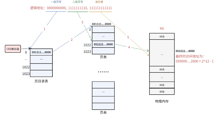 这里一张图就为大家解释清楚,我们知道虚拟地址共有32位,那么我们规定前10位所对应的数据代表页目录表的下标,通过前10位我们就能准确找到某个页表。 而我们规定中间的10位所对应的就是页表的下标,通过这个数据我们能准确定位到某个页框,而我们要访问的数据就在内存中的这个页框里面。 而我们通过页表只能定位到数据具体在哪个页框中,并不能准确定位数据所在的字节,那么此时就轮到虚拟地址的后12位发挥作用了,这12位就表示数据相较于当前页框起始地址的偏移量。 通过:起始位置 + 偏移量的方式,我们最终就能准确的知道数据在内存中的位置,精确到了字节!!!