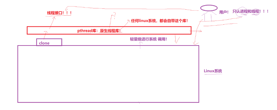 但是我们用户通过教材就只认进程和线程啊,难不成我用你Linux还得学习什么叫做轻量级进程吗,所以就封装实现了:pthread库,也叫做:原生线程库。