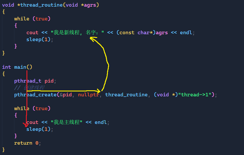 pthread_create(&pid, nullptr, thread_routine, (void *)"thread->1");