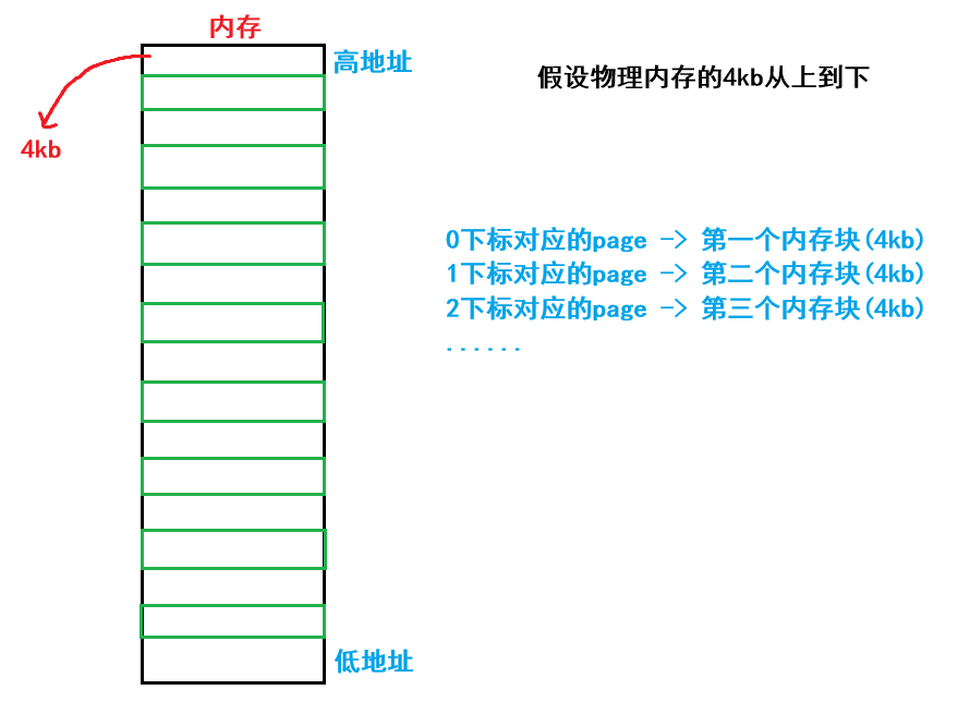 那么我们假设物理内存的4kb内存块由上到下是从高地址到低地址,那么就如我们上图所说的在这个数组中0号下标所对应的page就表示第一个4kb的内存块,1号下标所对应的page就表示第二个4kb的内存块,以此类推。