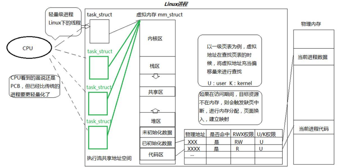 所以我们在最初对线程的描述中,说线程更加轻量化,上面就是原因,它不用和进程一样还要创建新的虚拟地址空间,页表等结构,只需要创建一个task_struct结构体即可。