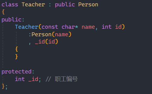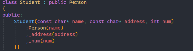 正如第一条所言,我们在写子类的构造函数时,在初始化列表部分要显示调用父类的构造函数,这里显式调用的格式就如上图所示,如果父类还有其他的成员变量,那么一并都写入父类的构造函数种。