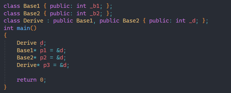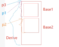 通过这个图就可以清晰观察到创建对象时指针的位置,p3==p1完全是巧合,正好都指向这段空间的起始位置,而p2就发生了指针偏移,经过切片后,base2基类的地址在中间的,因为前面是base1基类的地址,所以没有指向起始位置。