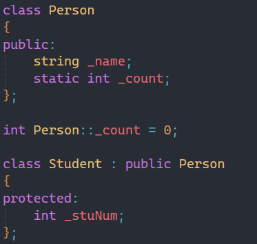 而静态成员通过检验可以看出,父类和子类_count的地址是一样的,说明父类和子类共用同一份静态变量。