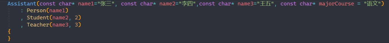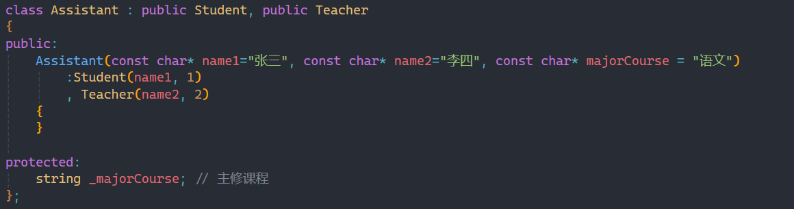 并且显式调用Person类的构造函数时,其实编译器并不会走student和teacher类中Person类构造函数那一行,也就是说写了之后只会走Assistant类中显式调用的Person类构造函数,不走其他两个的,即使显式调用了。
