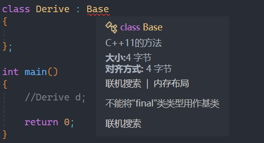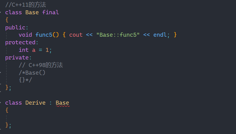 而c++11的方法相较于c++98简单了许多,直接在类名后面加一个关键字final,这样这个类就无法被继承了,就如上图所示。