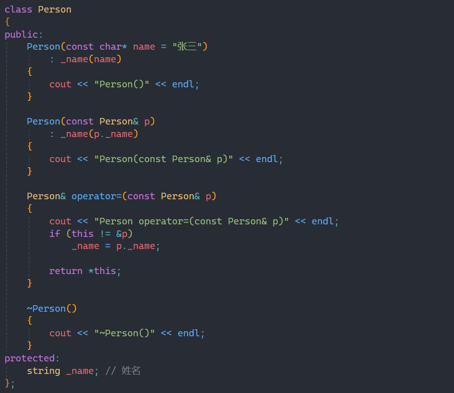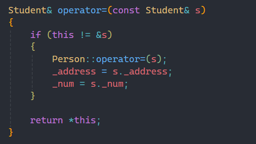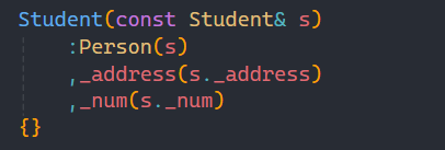 接下来呢时拷贝构造函数,这类有人可能有疑惑:为什么直接传s就可以呢? 这个就涉及到我们上一篇讲的基类和派生类之间的转化,有印象的朋友就能记起来子类对象可以赋值给父类的引用或指针,本质就是“切片”,而我们上面写的Person类中的拷贝构造函数正是引用,所以这里直接传子类对象即可。