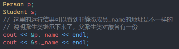可以看出如果是非静态成员,父类和子类_name地址是不一样的,说明派生类继承下来了,父类和派生类对象各有一份。