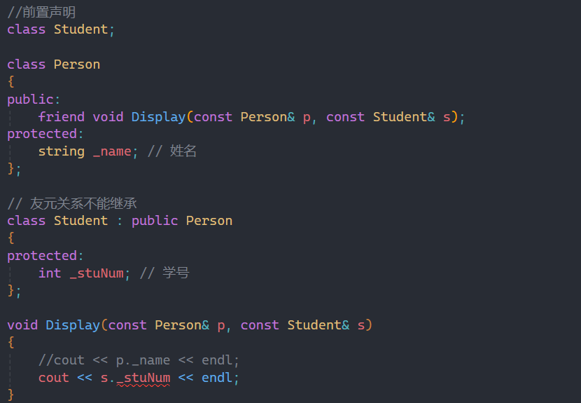 我们以上面的例子为例,在讲解之前,注意我上面写的前置声明,因为Display函数同时用到了两个类,而student类还没有实现,所以就在前面加上一个前置声明,来告诉编译器我下面有一个类叫student。