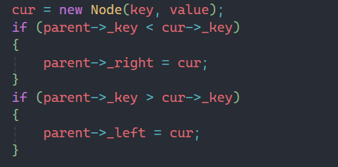 插入的思路很简单,根据二叉搜索树的特征,我们先跟根结点中的值进行比较,如果比它大,就走右边,比它小就走左边,然后更新cur的位置,直至找到空的位置。