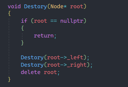 Destory函数的实现比较简单,首先判断此时结点是否为空,为空的情况下,直接返回即可;非空就利用递归先销毁左右子树,在销毁根结点即可。