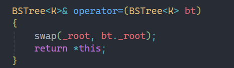 这种简单的方法我们之前就讲过,直接交换两者的根结点即可,这里要注意的是要是传值传参,不能是引用,因为我们不能改变=号右边的对象,传值传参就不会影响实参。